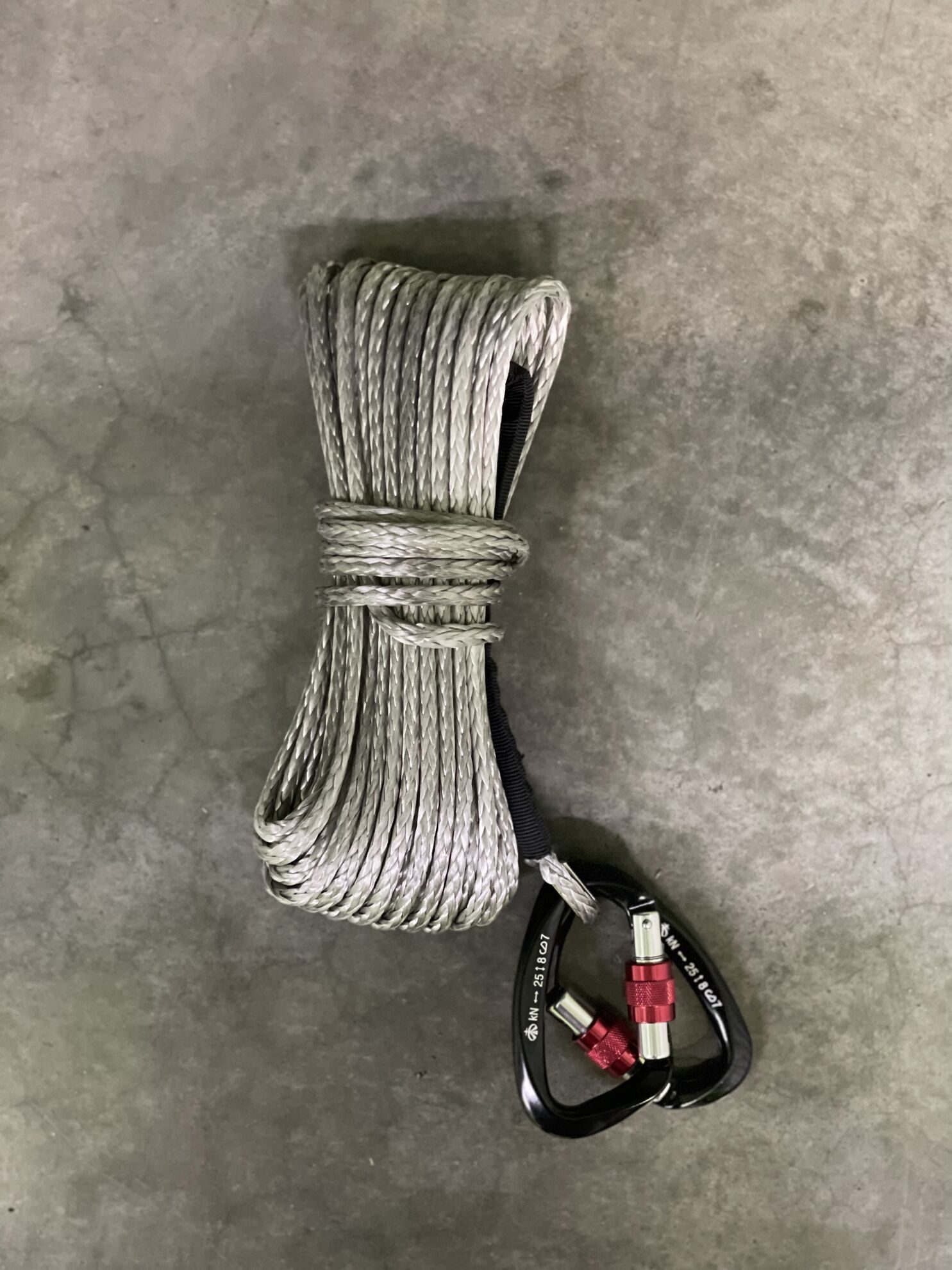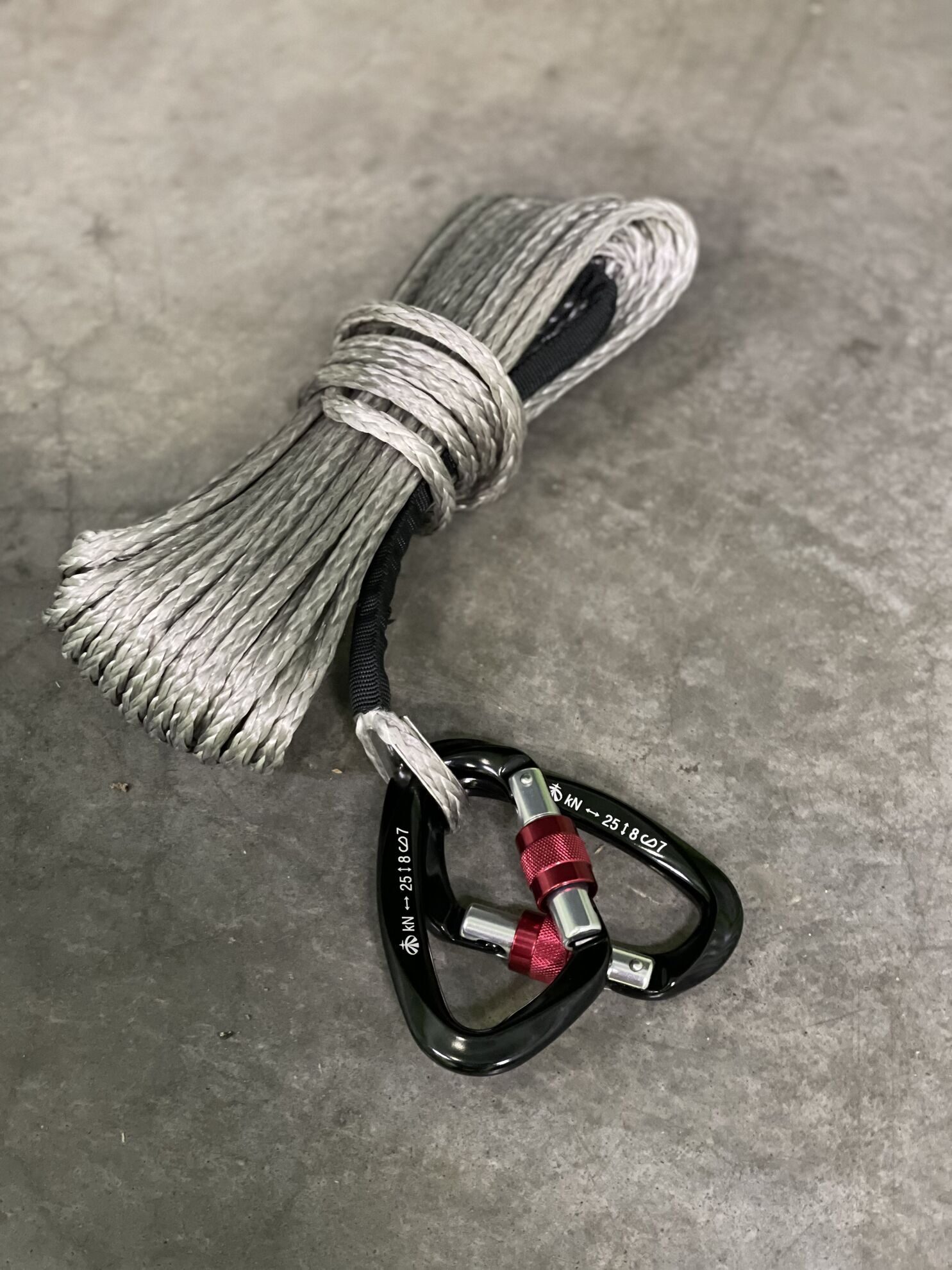 Состав комплекта: трос длинной 15 метров и 2 алюминиевых карабина.